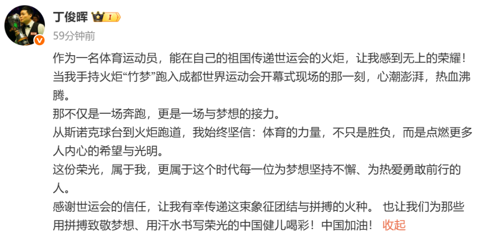 BG大游官方平台担任世运会火炬手,让丁俊晖感到无上荣耀!