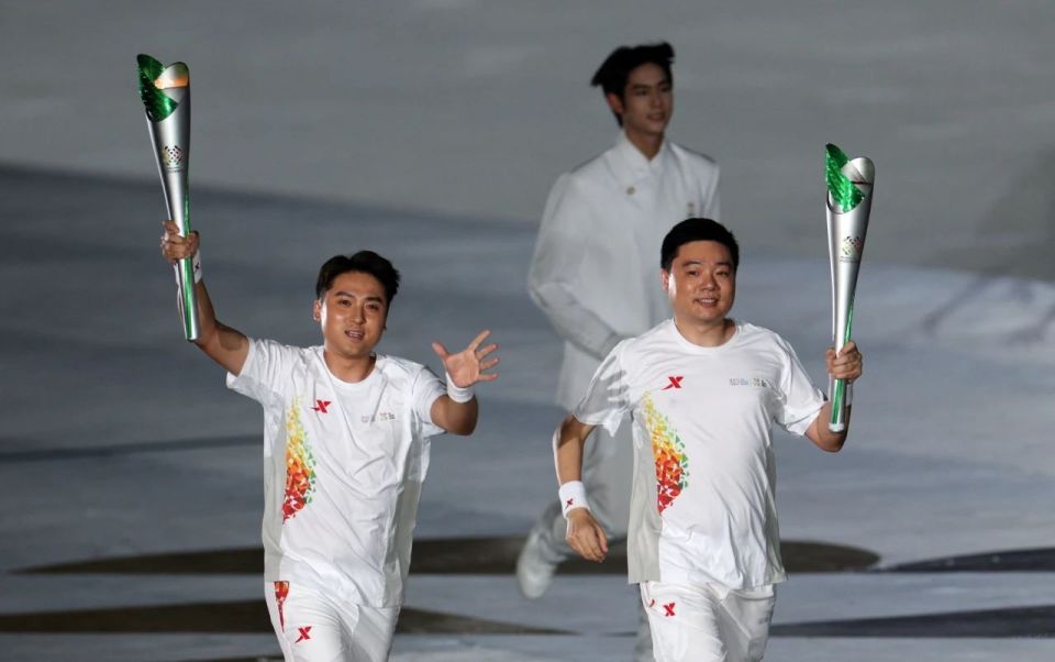备受瞩目的火炬传递及点燃环节,斯诺克传奇人物丁俊晖和蹦床奥运冠军董栋登场!